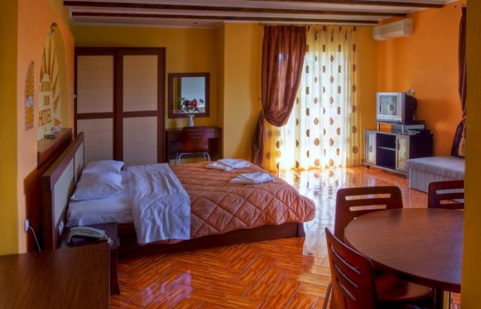 Toate camerele hotelului Astris Sun dispun de TV, radio, telefon, frigider, aer conditionat (conta cost – 5 €/zi.camera), acces internet Wi-Fi gratuit, seif si balcon. Camerele nu au chicineta si pot fi duble sau triple cu vedere la mare, la piscina sau la gradina. Baby cot disponibil la cerere (gratuit).