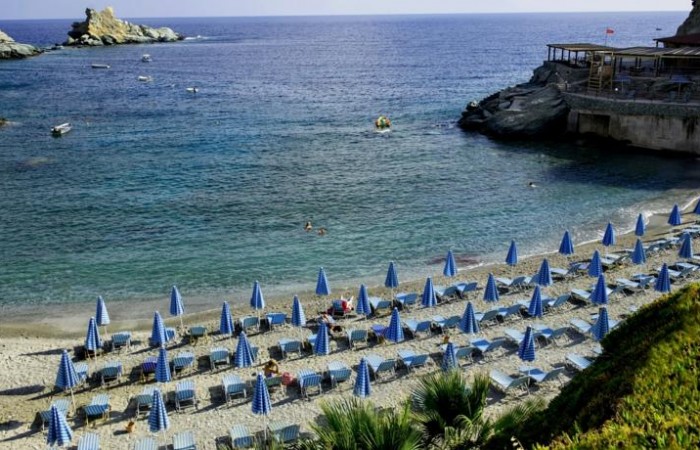 Plaja: Pietris, are forma unui golf. Transfer la plaja la fiecare 20 min, se poate coboara pe scari. Intrarea in mare: nisip cu pietris marunt. Plaja este amenajata cu dus.