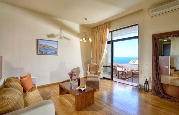 • family 2 bedrooms maisonette style SV (vedere la mare, 2 nivele: nivelul superior – living – dormitor cu pat extensibil, baie; nivelul inferior – dormitor, 2 paturi separate (pat dublu la solicitare), baie, max. 4 pers., 30-35 m2);