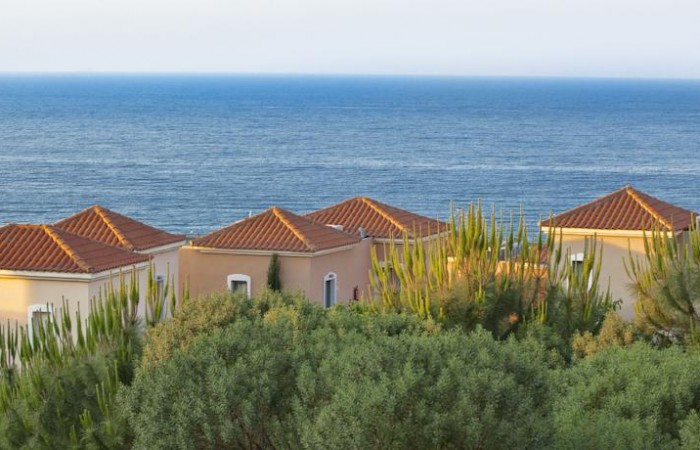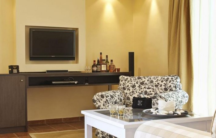 Hotelul dispune de 275 camere duble si family ce au urmatoarele faciitati: au aer conditionat, TV cu canale prin satelit, mini frigider, faciliati de preparare cafea/ceai, baie cu dus/cada, uscator de par, articole de toaleta gratuite, terasa/balcon, seif (contra cost), telefon. Camerele au vedere la mare sau la gradina. Internet wireless este disponibil in zonele publice si este gratuit.Restaurantul principal de la Village Resort & Waterpark ofera micul dejun, pranzul si cina tip bufet, cu preparate din bucataria greceasca si mediteraneana. Snack barul este deschis pe toata durata zilei si serveste bauturi racoritoare si alcoolice, precum si cocktailuri.