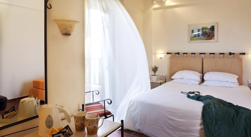 Hotelul dispune de 275 camere duble si family ce au urmatoarele faciitati: au aer conditionat, TV cu canale prin satelit, mini frigider, faciliati de preparare cafea/ceai, baie cu dus/cada, uscator de par, articole de toaleta gratuite, terasa/balcon, seif (contra cost), telefon. Camerele au vedere la mare sau la gradina. Internet wireless este disponibil in zonele publice si este gratuit.Restaurantul principal de la Village Resort & Waterpark ofera micul dejun, pranzul si cina tip bufet, cu preparate din bucataria greceasca si mediteraneana. Snack barul este deschis pe toata durata zilei si serveste bauturi racoritoare si alcoolice, precum si cocktailuri.