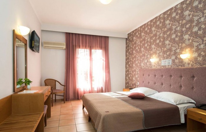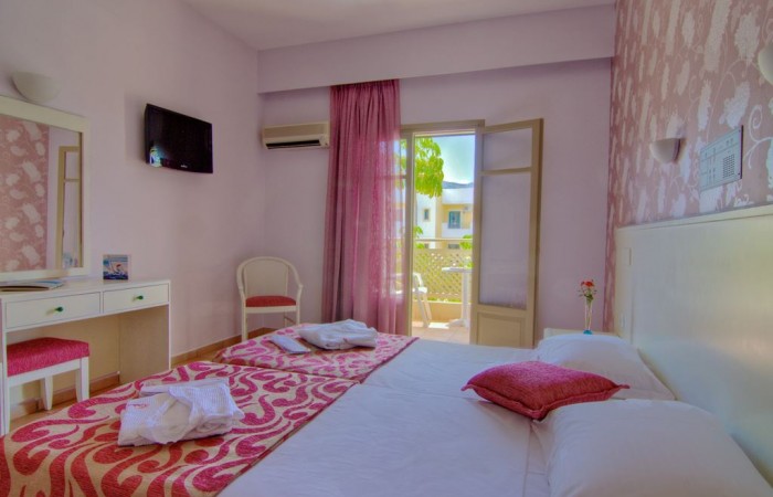 Camerele decorate cu gust ale hotelului au urmatoarele facilitati: aer conditionat, TV prin satelit si mini-frigider, baie privata cu articole de toaleta gratuite si uscator de par, fierbator electric, balcon. Camerele au vedere la piscina sau la munte. Internet wireless este disponibil in intregul hotel, contra cost. Restaurantul hotelului Solimar Ruby ofera preparate grecesti si internationale pe tot parcursul zilei. Snack barul de lânga piscina serveste mese usoare si bauturi racoritoare.Activitatile din cadrul proprietatii includ panou de darts, biliard si tenis de masa. Micii oaspeti ai hotelului au la dispozitie un loc de joaca si piscina special amenajata pentru ei. La piscina exterioara  exista sezlonguri si umbrele de soare.
